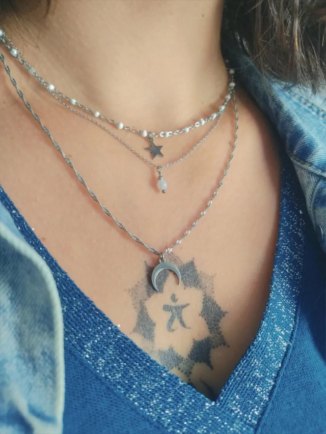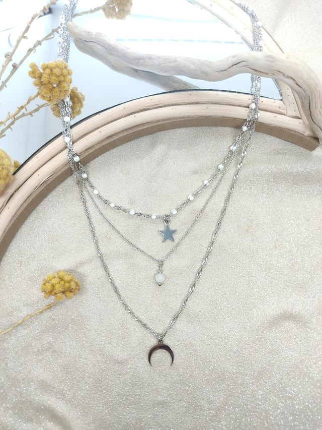 Collier 3 rangs en acier inoxydable ajustable 39-43cm (chaîne la plus longue 47cm), émail et Péristérite .