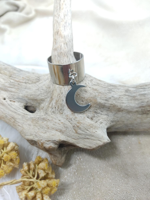 Bague ajustable large en acier inoxydable et breloque lune.