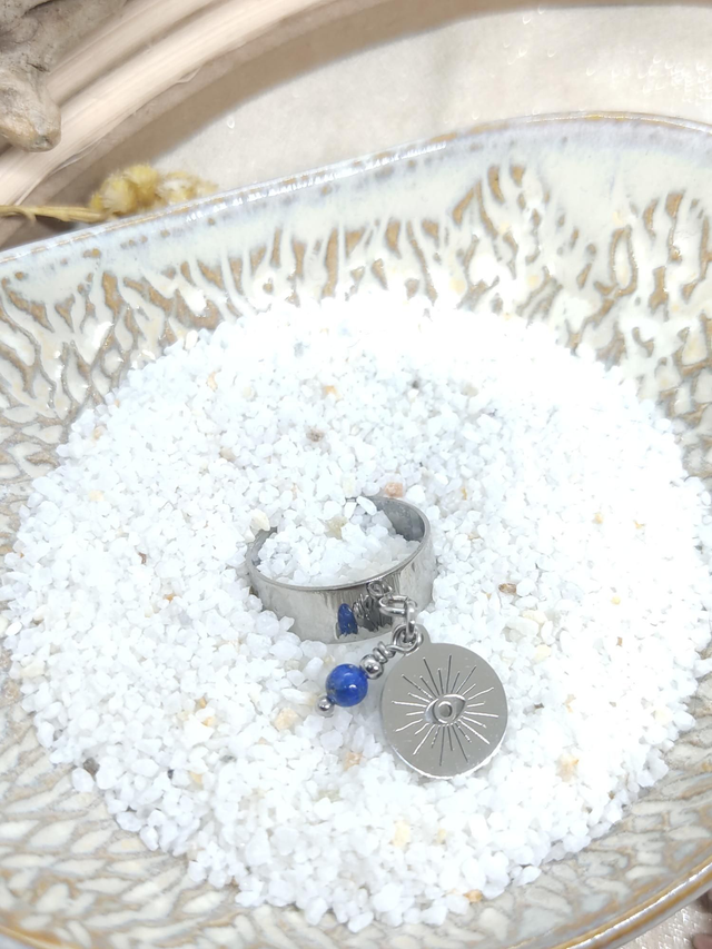 Bague ajustable en acier inoxydable, breloque œil et Lapis-lazuli